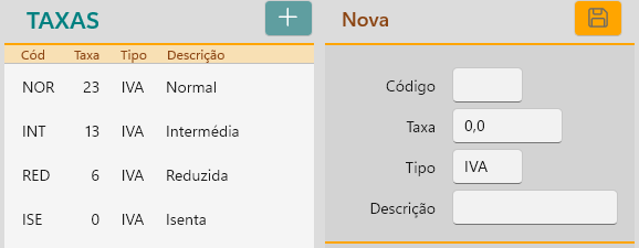 As Taxas (IVA) já se encontram preenchidas para Portugal Continental. Se estiver noutra Região deverá alterar conforme legislação em vigor.
