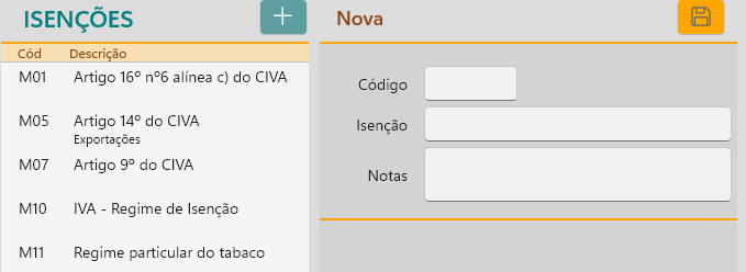 As Isenções, inicialmente estão criadas algumas como exemplo. Deverá editar a lista de modo a contemplar as necessidades para o que, se necessitar, deverá perguntar ao seu contabilista ou consultar a AT.